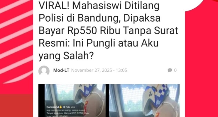 Dugaan pemerasan itu viral di media sosial (medsos) Instagram. Dalam unggahan itu tertulis narasi "Viral! Mahasiswa ditilang polisi di Bandung, dipaksa bayar Rp550 rribu tanpa surat resmi: ini pungli atau aku yang salah?". Dalam unggahan itu juga tampak foto seorang polantas dari samping kiri.